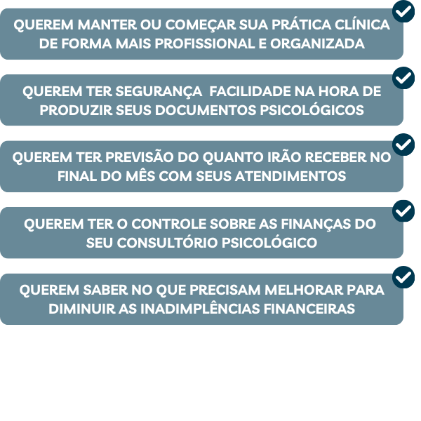 No decorrer da minha carreira, percebi que muitos profissionais iniciantes e já experientes, tinham dificuldades em produzir documentos psicológicos e organizar as finanças da sua clínica, por vezes, não sabendo o quanto entre e nem o quanto sai. A proposta desse PACK é facilitar sua organização clínica, seja na entrega de documentos, seja na sua organização financeira.